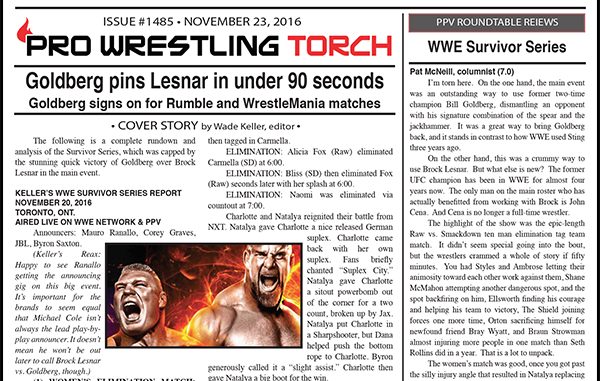 SUMMARY: This week’s newsletter is packed with Big Event coverage including Keller’s NXT Takeover Toronto report, Keller’s WWE Survivor Series report, and Keller’s Raw report, all with tons of analysis and also star ratings. Plus, Staff Reviews & Scores for Survivor Series, Greg Parks’s feature column on the Raw vs. Smackdown matches, and a brief Torch Newswire.