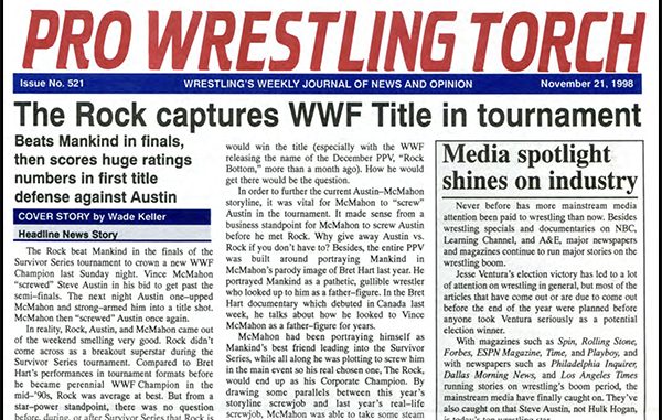 SUMMARY of #521 cover-dated November 21, 1998: This issue features in-depth coverage of the Survivor Series PPV including Rock capturing the WWF Title in a tournament… A Cover Story looks at the mainstream media spotlight shining on the wrestling industry… An update on the Vince McMahon-Steve Austin controversy (our controversial coverage of their behind the scenes problems prompted a phone call from Vince McMahon around this time resulting in an hour-long conversation to talk things through)… Information wrestler payoffs for SummerSlam… The latest on the heated ratings battle between Raw and Nitro… Plus full coverage of Raw, Nitro, and ECW TV shows… And more…