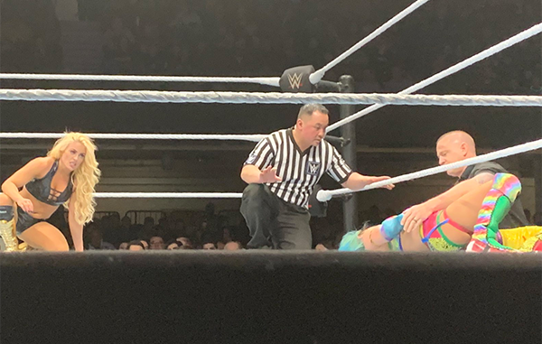 (6) Asuka wrestled Mandy Rose to a no contest when Asuka couldn’t finish. Mandy’s move on Asuka looked terrible and Mandy looked terrified after it happened. It looked like Asuka wanted to do a roll-through and Mandy was doing a wheelbarrow type face-buster and just went down right onto her head. So it was pretty clear they messed up. Mandy was looking scared. The ref called for one trainer. Then Fit Finlay and about three or four ohers came down. They talked to Asuka for about two minutes. The ref then updated Mandy on what was going on. Mandy was then trash-talking at them and Asuka. They announced it was a no contest. They helped Asuka back. Mandy then took the title on the stage and held it up.