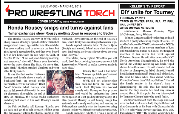 SUMMARY: This week’s PWTorch Newsletter includes Wade Keller’s cover story on Ronda Rousey and Becky Lynch going at it on social media and then Ronda turns on Raw… Greg Parks reviews “Fighting With My Family” movie… Keller’s WWE house show report… Keller’s reports on NXT TV, Raw, and Smackdown… Ringside Beat house show reports… Torch Newswire…
