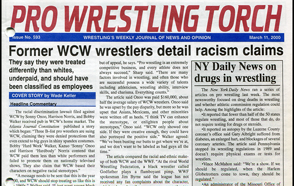 SUMMARY of #593 cover-dated March 11, 2000: This issue features a cover story on a number of WCW wrestlers claiming they were victims of racism… A cover sidebar summarizes a New York Daily News article on drugs in pro wrestling… WCW Newswire covers the disintegrating promotion including Hulk Hogan’s blow-up with top management, Sid’s unproductive push, Goldberg’s status, and the post-Russ/Ferrara booking committee… WWF Newswire covers the controversial situation with the Barbara Bush and how a romance with a WWF wrestler may have played a part in her eventual dismissal and Rock taking a dig at Mick Foley… ECW Newswire covers a major controversy with Sabu and Paul Heyman… The Top 50 Stories of 1999 feature… Letters to the Torch reacting to Mick Foley’s retirement match… End Notes by Wade Keller (prophetically) asks if WCW was becoming more trouble than it’s worth… Plus detailed reports on Raw, Nitro, Smackdown, ECW on TNN, and other programs…