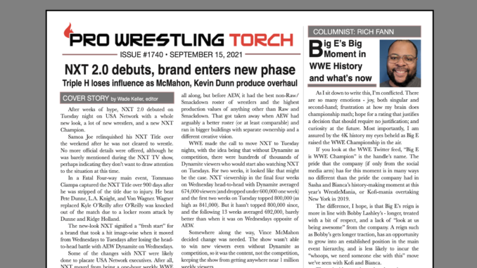SUMMARY: This week’s PWTorch Newsletter features Wade Keller’s cover story on NXT 2.0… Rich Fann’s feature column on Big E’s historic WWE Title win… Greg Parks’s feature column looks at possible AEW to WWE jumps… Keller’s TV reports on WWE Smackdown, AEW Rampage, WWE Raw, and NXT 2.0… Torch Newswire… More…