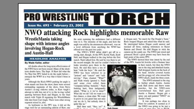 SUMMARY of #693 cover-dated February 23, 2002: This issue includes a cover story on the NWO returning to the WWF and attacking The Rock on Raw… In-depth coverage of the WWF No Way Out PPV including Keller’s match report with star ratings, Roundtable Reviews, Reader Reax, and Poll Results… The Top 50 Stories of 2001 with stories on each of the top 10… WWF Newswire with Scott Hall backstage news, Hulk Hogan interview excerpts, and more… Plus Wade Keller’s End Notes, TV reports on Raw and Smackdown, ETC. Newswire, Ratings Analysis, 1992 Backtrack, and WWF Ringside Beat…