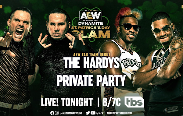 AEW issued a press release today hyping the in-ring debut of the Hardy Boys. They will take on Private Party of Isiah Kassidy & Marq Quen on tonight’s “St Partrick Day Slam” edition of Dynamite.