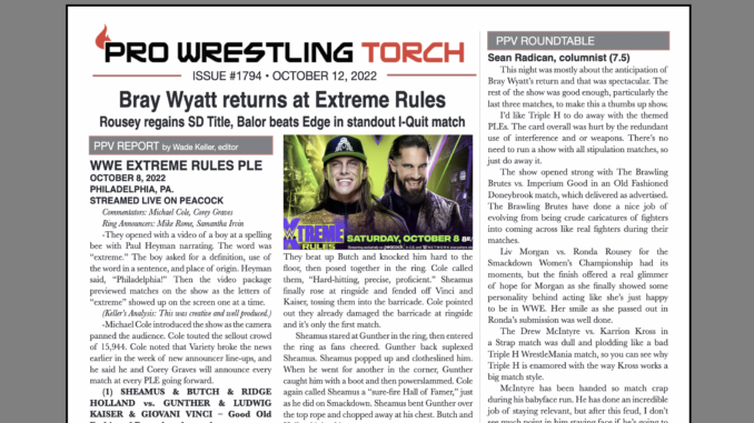 SUMMARY: This week’s PWTorch Newsletter features Wade Keller’s Keller’s WWE Extreme Rules report & Staff Roundtable Reviews… Greg Parks feature column on WWE announcing shake-up… Torch Newswire… Keller’s TV reports on Dynamite and Smackdown…
