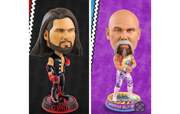 The A.J. Styles Bighead features him in an action pose wearing his signature outfit and standing on top of a thematic base. The Superstar Billy Graham Bighead also features him in an action pose wearing his signature outfit and standing on top of a thematic base. Both Bigheads are limited to 144 units, retail for $55, and stand at nearly 10 inches tall.
