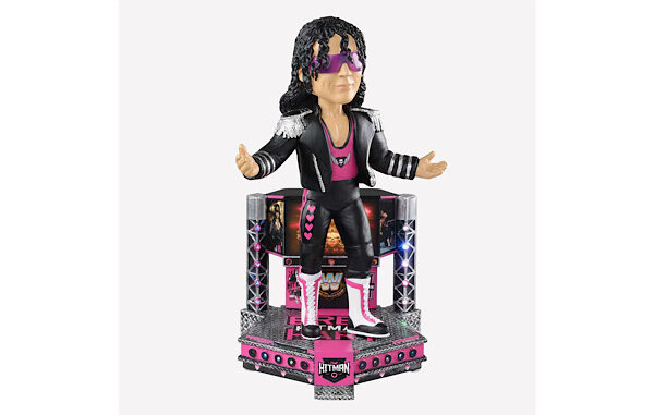 The Bret Hart bobblehead features him in an action pose wearing his signature outfit and sunglasses atop a stage themed base. For the first time ever with a WWE FOCO bobblehead, the stage lights up along the sides and on the bottom. Hart’s logo and nickname, “The Hitman,” can be found in multiple places on the base as well. The Hart bobblehead is limited to 223 units, stands at 7 inches tall, and retails for $90.