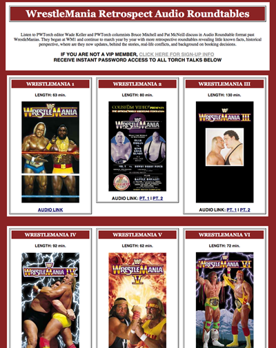 One of the favorite features we've added in recent years is our WrestleMania Retrospect Audio Roundtable Series. PWTorch editor Wade Keller and senior columnists Bruce Mitchell and Pat McNeill dedicate around an hour or more to each of the first 12 WrestleManias going match by match through the line-up and talking about the backstage booking controversies, reviewing the match quality, talking about the historical significance, and more - all from three of pro wrestling's most tenured, informed insiders. We will be adding more retro WrestleMania Audio Roundtables before this year's event!