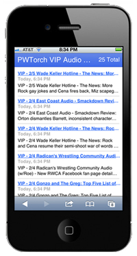 Thanks for your interest in becoming a PWTorch VIP member! -Last Friday's 3.5 hour interview with former WWE Creative Team Member Alex Greenfield including a 103 minute VIP Aftershow featuring revealing backstage insight into the entire process of how the Royal Rumble is scripted, how much of it is scripted, who scripts it, how the plans are communicated to wrestlers, how much of it is practiced ahead of time, and when wrestlers find out their role in it. Plus backstage insight into the top power brokers in WWE including very frank negative comments about Kevin Dunn and Triple H, what John Cena is like behind the scenes, among others. In fact, once you're a member, you can use these links to get instant access to these insider audio interviews by Wade Keller: WWE BACKSTAGE ACCESS INTERVIEW SERIES: 3 WRITERS, 3 ERAS -JOHN PIERMARINI, pt. 1 (57 min. - late-2000s WWE creative team member) -ED FERRARA, pt. 1 (67 min. - late-90s WWE creative team member) PLUS - BONUS INTERVIEW - WADE KELLER'S 1999 ONE-ON-ONE INTERVIEW WITH THE ROCK, THE LONGEST INSIDER INTERVIEW ROCK HAS EVER DONE... -THE ROCK, pt. 1 (45 min. - Wade Keller's 1999 one-on-one interview) AND ONE OF OUR MOST CONTROVERSIAL, TALKED-ABOUT INTERVIEWS EVER... THE MOST BLUNT (NSF) INTERVIEW WITH LUTHER REIGNS JUST HOURS AFTER HE WAS RELEASED BY WWE... -LUTHER REIGNS, pt. 1 (40 min.) Plus CLICK HERE for links to Wade Keller's Torch Talks with the following others: Eric Bischoff (over five hours from 2009)... Mick Foley (nearly two hours from 1991)... Lanny Poffo (four hours from 2008)... Verne Gagne (from 1988)... Jim Cornette (from 1990)... Ted DiBiase Sr. (from 1994)... Al Snow (from 1995)... Diamond Dallas Page (seven hours from 2011, walking through his career and Nitro Monday Night War era with great backstage stories on many top WCW stars!)... Here's an overview of everything that comes with a VIP membership! -Around 60-75 new VIP-exclusive audio shows each month including the daily Wade Keller Hotline, Bruce Mitchell Audio Show with Wade Keller (two hours a week), VIP Livecast Aftershows (including Interview Friday extended sessions), Post-PPV Audio Roundtables (Sunday nights after PPVs with Keller, Mitchell, Pat McNeill), Gonzo & The Greg's Weekly Countdown List (e.g. Best Celebrities in Pro Wrestling, Best Royal Rumble Surprises, Top 5 Returning Wrestler Moments, Five Worst Finishing Moves, etc.), East Coast Audio, Radican's Wrestling Community, and more! -20 Years Ago Wade Keller Radio Shows - new every week! Listen to Keller's KFAN radio show from the early 1990s, now becoming available online for the first time ever, with a new one each week on its 20th anniversary of originally airing. Just posted last week, the first and perhaps most in-depth insider interview with Jesse Ventura. Other big-name guests including Mick Foley, Paul Heyman, Jim Cornette, and more, along with Journalist Roundtables with Keller, Bruce Mitchell, Mark Madden, Dave Meltzer, Alex Marvez, and others. ***LISTEN TO PWTORCH VIP AUDIO SHOWS ON YOUR IPHONE VIA SYNCING ITUNES ON YOUR MP3 PLAYER OR PHONE, DOWNLOAD OR STREAMIING ON YOUR PC, OR VIA OUR RSS FEED ONE CLICK AWAY ON YOUR IPHONE'S HOME SCREEN (we walk you through how to set everything up in seconds!)*** TEST OUR VIP AUDIO FEED NOW IF YOU'RE USING AN IPHONE OR IPAD!