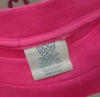 The WWF sold t-shirts at live events and through merchandise catalogues inserted in WWF Magazine and programs during the 1980s. Many of these shirts have a white tag in the collar with a blue WWF logo; that’s one way to verify a shirt’s authenticity. However, many early-to-mid-1990s shirts do not have a WWF tag.