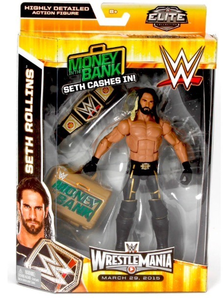 The figure celebrates Rollins’s crowning moment of 2015 when he cashed in his Money in the Bank briefcase and crashed the main event of WrestleMania 32, becoming the new WWE World Heavyweight Champion. The figure depicts Rollins with the same attire he wore that night, and also comes with a Money in the Bank briefcase and WWE World Heavyweight Title belt.
