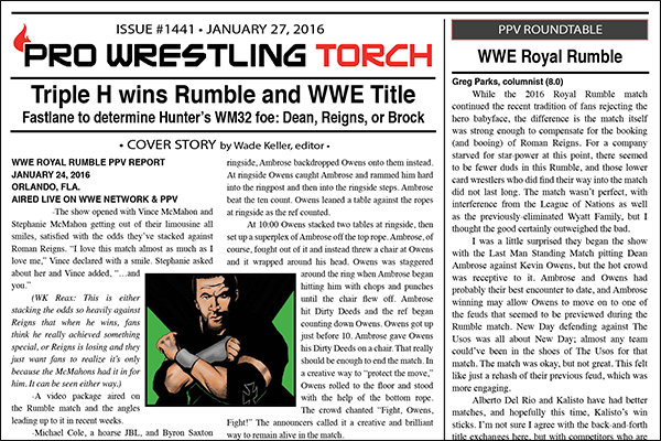 SUMMARY: Wade Keller’s cover story presents his detailed report on the Royal Rumble including star ratings for each match… Then Staff Roundtable Reviews of the Royal Rumble with scores by Bruce Mitchell, James Caldwell, Sean Radican, Todd Martin, Greg Parks, and Wade Keller… Keller’s Raw Report with analysis thoughout… Newswire coverage of the week’s top stories and insider tidbits including which wrestler in the Royal Rumble got a key part of the changed… VIP exclusive feature columns from Greg Parks and Bruce Mitchell looking ahead to WrestleMania 32… Wade Keller’s End Notes on why the Roman Reigns experiment really should be over, at least as far as him being a top babyface…