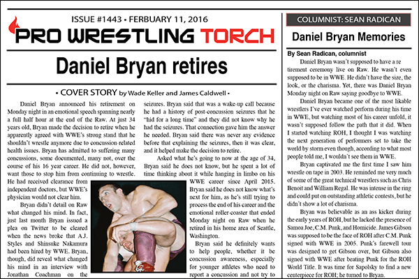 SUMMARY: Wade Keller’s cover story presents an overview of the Daniel Bryan retirement announcement… Sean Radican writes a personal article about what Bryan’s career meant to him as a fan and journalist… Bruce Mitchell’s column looks at how Bryan is leading the way again in a new way… Greg Parks’s feature column presents three points of view on three topics – NXT TV, Matt Hardy’s heel character, and Big Show’s career… Wade Keller’s newsletter-exclusive reports on WWE Raw and TNA Impact… Ringside Beat reports on WWE and NXT… Torch Newswire coverage of top stories from the week…