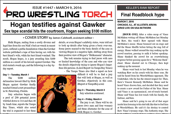SUMMARY: This week’s cover story marches through the first week of the Hulk Hogan-Gawker trial day by day… Bruce Mitchell’s column presents the argument that Vince McMahon really has listened to the fans… Greg Parks’s feature column looks at whether there were alternatives to Shane McMahon vs. Undertaker as a featured WrestleMania 32 match… Ringside Beat presents WWE and NXT live event results from correspondents around the country… Torch Newswire features excerpts of the Vince McMahon interview with Brian Fritz… Plus Wade Keller’s detailed report with analysis of the latest Raw and Impact episodes…