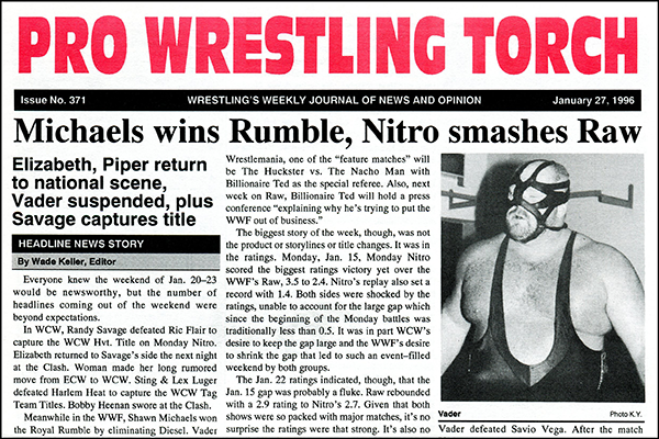 SUMMARY of #368 cover-dated Jan. 6, 1996: This issue includes a cover story on the heated up battle between WCW and the WWF in the Monday Night War, including the Vader signing announcement and WCW spoofing Hulk Hogan and Randy Savage… WCW Newswire details a controversy with the U.S. Title with a match for strange political reasons and Gene Okerlund running a retraction demanded by Rick Steamboat… WWF Newswire details the Royal Rumble and Jim Cornette’s future with the company now that SMW shut down… ECW Holiday Hell from ECW Arena covered in depth including Raven vs. Sandman… A detailed WWF house show report from Las Vegas featuring Undertaker vs. Yokozuna and Razor vs. 1-2-3 Kid… Part four of the Chris Benoit “Torch Talk”… Letters to the Editor… Wade Keller’s feature editorial on Cactus Jack’s controversial message to hardcore fans… Plus Editor’s Notes, Quotebook, reports on Raw, Nitro, and ECW TV, plus more…