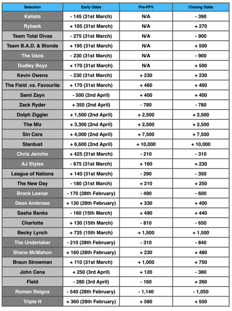 Saturday’s big shifts in the WrestleMania match betting lines proved to be a good indicator of actual match results on Sunday.