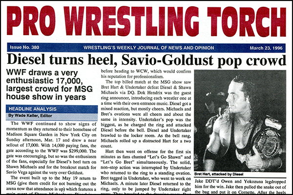 SUMMARY of #380 cover-dated Mar. 16, 1996: This issue includes a cover story detailing WWF’s biggest MSG crowd in years with enthusiastic response to Diesel’s turn, emerging Savio Vega… Chris Zavisa forecasts the future well with analysis of Shawn Michaels, Chris Benoit, and Eddie Guerrero leading the next generation of smaller, better workers into main events… Wade Keller’s End Notes reacts to the MSG crowd and previews WCW’s Uncensored… Torch Talk with Marc Mero, pt. 2… John Williams’s detailed report on Konnan’s latest booking effort for AAA in Tijuana… Plus reports on Raw, Nitro, ECW, USWA, and Japan TV shows, WWF Newswire, WCW Newswire, ETC. Newswire, Letters to the Editor, and more…