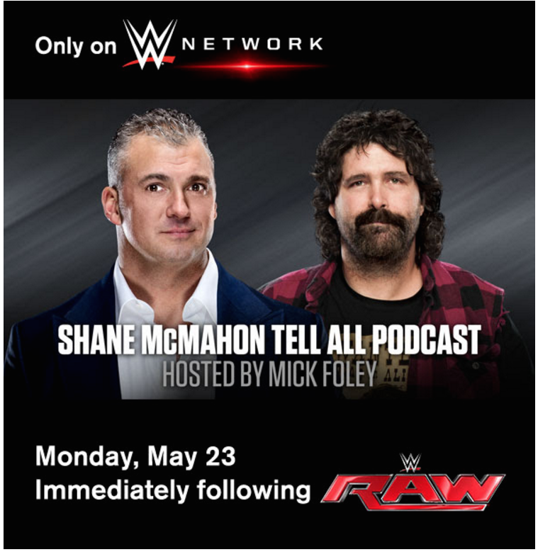 Monday night during Raw, WWE ran a new promo spot for the Shane McMahon live podcast interview hosted by Mick Foley on May 23 following Raw.