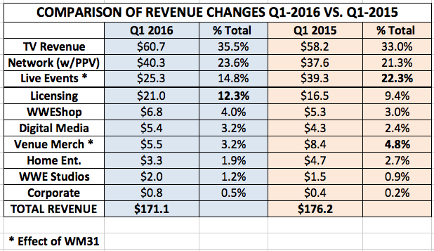 WWE reported First Quarter 2016 revenue of $171.1 million, down from Q1-2015 when including the effect of WrestleMania, but up from Q1 if excluding WrestleMania for comparability.
