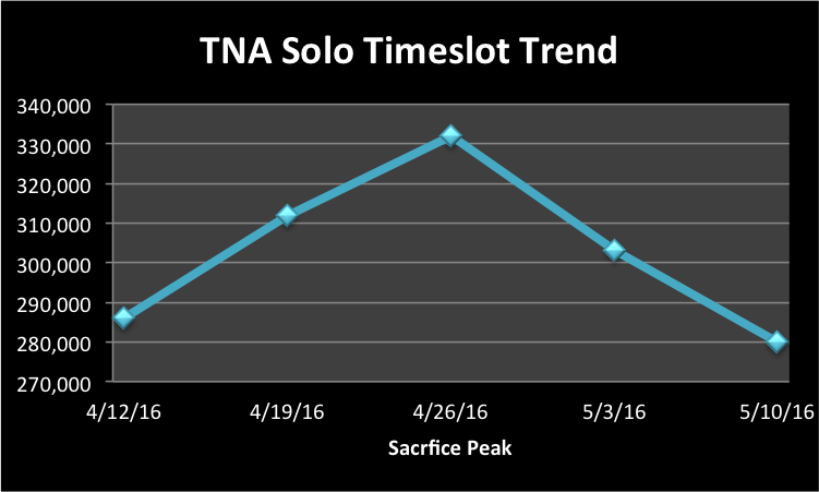 Tough night. Lots of competition in the form of NBA and NHL playoffs. Still, TNA cracked the top 150 again. They’ve been consistent on that front.