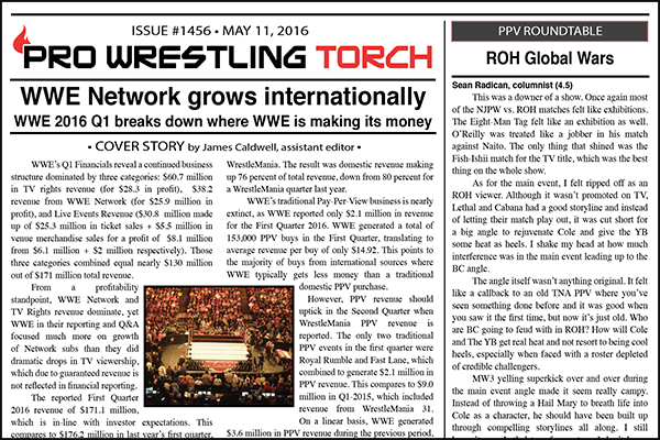 SUMMARY: This week’s newsletter begins with an in-depth cover story on WWE Q1 2016 Financials with tons of details on the WWE Network, state of PPV business, Vince McMahon and George Barios conference calls, and WWE’s trends… Wade Keller’s End Notes processes the Q1 financial info and points out a few key things that jump out as most relevant… ROH Global Wars PPV Roundtable Reviews from PWTorch staff… Ringside Beat house show reports from WWE, NXT, and more… Torch Newswire coverage of top stories from the week in pro wrestling… Greg Parks’ feature column analyzes the WWE roster cuts… Bruce Mitchell writes about “The Club”…