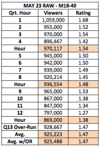 The quarter-hour ratings for Monday’s post-Extreme Rules Raw episode indicate strong interest for the immediate PPV fall-out, dips at the end of each hour, solid increases at the top of the each hour (including the over-run), and very noticeable viewer fatigue in the third hour.