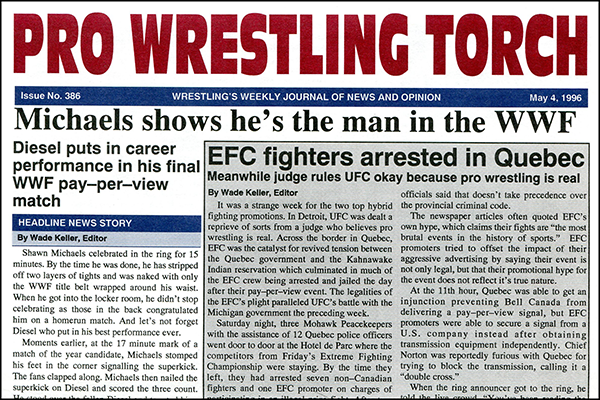 SUMMARY of #386 cover-dated Apr. 20, 1996: This issue includes coverage of the Shawn Michaels vs. Diesel PPV headline match that was a statement by Michaels about the transition from the Bret Hart Era to the HBK Era, plus in-depth coverage of the entire In Your House PPV… Wade Keller’s feature BBL editorial assessing the state of the Monday Night War after eight months… A cover sidebar report on MMA fighters arrested in Quebec… Plus Wade Keller’s End Notes, WWF Newswire, WCW Newswire, ETC. Newswire, reports on Raw, Nitro, ECW TV, USWA, and Japan TV shows, and more.