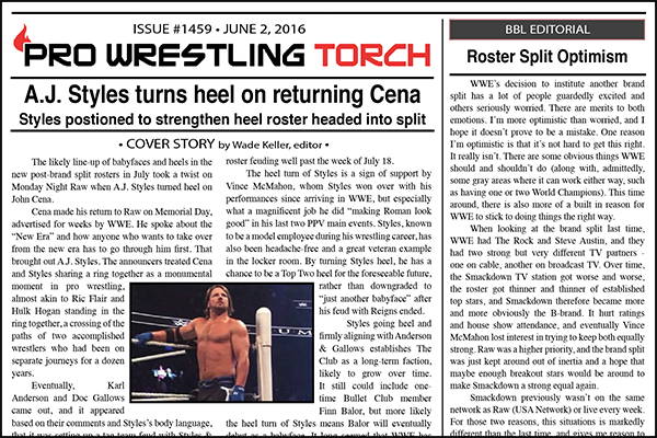SUMMARY: This week’s newsletter begins with a cover story on the A.J. Styles heel turn on John Cena in his return to Raw… Wade Keller’s BBL editorial look at some worries people have about the upcoming WWE roster split… A loaded Ringside Beat including Progress Wrestling in the U.K., New Japan, NXT, and WWE live event correspondent reports… Torch Newswire looks at the latest WWE ratings, MSG’s line-up, the latest in the WWE concussion court happenings, Sean Radican’s review of the Will Ospreay vs. Ricochet match, and more… Keller’s WWE Raw Report with analysis… Greg Parks’s column looking at the latest roster split and what can be learned from it… Bruce Mitchell’s column on an indy show experience that showed what not to do if you’re an indy promoter…