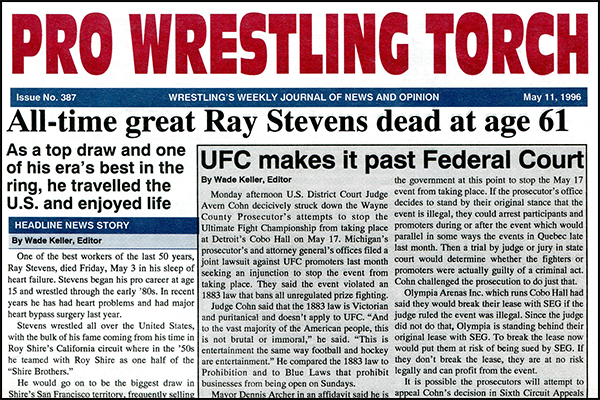 SUMMARY of #386 cover-dated Apr. 27, 1996: This issue includes coverage of the death of Ray Stevens and a UFC’s battle in Federal Court… WWF Newswire details the strange womanizing angle with Shawn Michaels on Raw… Wade Keller’s BBL feature editorial uncovers Mother’s Day Notes from Bret Hart, Hulk Hogan, Marcus Alexander Bagwell, Blue Meanie, Dustin Rhodes, and more… Bruce Mitchell’s feature column looks at Eric Bischoff’s promoting style of WCW… John William sreviews TripleMania in Chicago… Torch Talk with Konnan, pt. 6 feature behind the scenes info on ECW… Plus Wade Keller’s End Notes, WWF Newswire, WCW Newswire, ETC. Newswire, reports on Raw, Nitro, ECW TV, USWA, and Japan TV shows, and more.