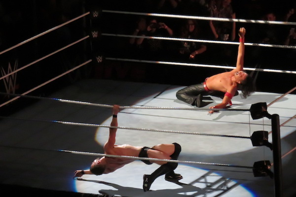 (2) Andrade “Cien” Almas beat Blake. Dead for Blake; he got Murphy and Bliss chants. Blake took the microphone and told crowd he was “beautiful, blonde, Blake.” Another back and forth match. Cien won via DDT finisher (similar to Dirty Deeds with sweep of the leg) after running double knees in the corner. They messed up the first attempt at the finishing move and had to do twice, so it was a bit odd-looking. The crowd was not super into this match but was overall pro-Cien.