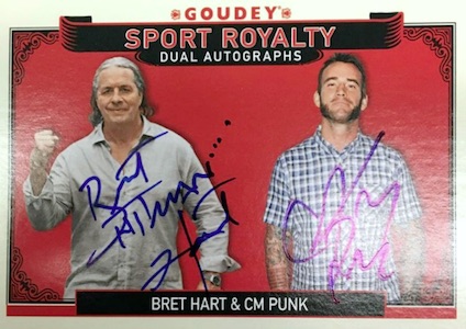 Punk and Hart appear together on a card in the Goudey Sport Royalty Dual Autographs subset. This rare card features on-card signatures of both legendary wrestlers. For the Inscriptions subset, the athletes added a little something extra to their signatures, such as a nickname or saying associated with that person.