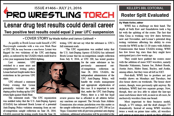 SUMMARY: This week’s newsletter begins with a cover story on Brock Lesnar’s USADA drug test flagging and it’s impact on his MMA and pro wrestling careers… Wade Keller’s BBL editorial looking at the WWE Draft and how Raw and Smackdown each fared… Ringside Beat reports on WWE, NXT, Evolve, and more… Torch Newswire including coverage of the class action concussion lawsuits involved by dozens of wrestlers… Keller’s WWE Raw report and WWE Smackdown report with analysis thorughout… Greg Parks’s column looking at anew book on what turned the tables in WWE’s favor in the Monday Night War… Bruce Mitchell’s column on ioneer journalist Dave Meltzer entering the Pro Wrestling Hall of Fame this weekend…