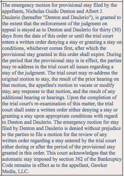 The decision followed Gawker filing an emergency motion for stay on July 25 (Monday) on behalf of Denton and Daulerio.