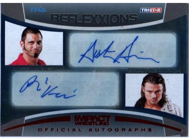 Aries and Kendrick are linked together by one very cool trading card. Their signatures appear together on a 2012 TRISTAR TNA Reflexxions Dual Autograph. At the time, the two men were feuding over TNA’s X Division Title. In 2016, however, the card is a reminder of two sentimental favorites who have traveled so far. The basic version of this card can usually be found for $15 or less, with serial numbered parallels selling for more.