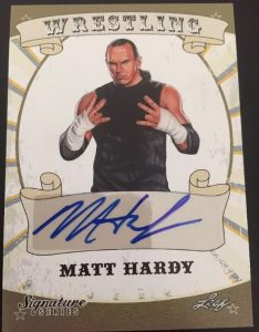 Most recently, Matt was included in 2016 Leaf Wrestling Signature Series. His basic autographs from that set can usually be found for $10-15.