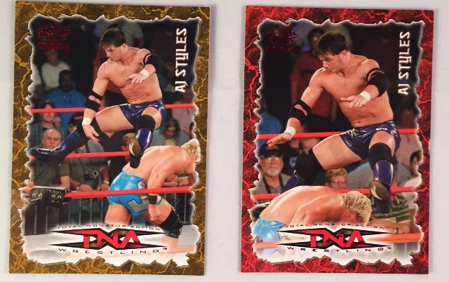 Collectors may want to keep an eye on Styles’s cards from Pacific Trading Cards’s 2004 TNA set. Styles has two basic cards that are essentially the same: card #47 (red border) and card #71 (gold border). The entire 2004 Pacific TNA set was an afterthought for years, but it turns out that set included the first cards (some label them “rookie cards”) of future top stars.Styles’ base cards from this set were basically worthless for years, but now they sell in the $5-10 range.