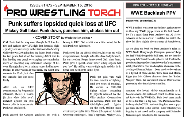 VIP NEWSLETTER – PRO WRESTLING TORCH #1475 (September 14, 2016) – Punk loses at UFC 203, Styles captures WWE Hvt. Title, Backlash Roundtable Reviews, Parks column on Decay or Delete, more