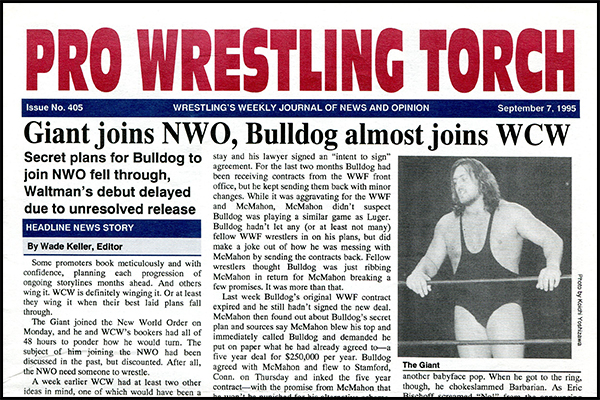 SUMMARY of #405 cover-dated September 7, 1996: This issue includes a cover story on Giant joining the NWO and British Bulldog almost jumping to WCW… John Williams’s major feature on Riki Choshu’s career… Two USWA live event reports… Letters to the Editor on a variety of subjects… WWF Newswire details the Bret Hart watch and more… WCW Newswire details Nitro setting a ratings record unopposed… Reports on Nitro, Superstars, ECW, USWA, All Japan, New Japan, and more…