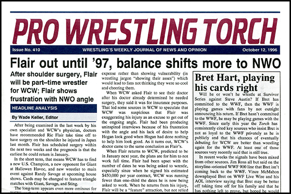 SUMMARY of #410 cover-dated October 12, 1996: This issue includes a cover story on Ric Flair’s hiatus from WCW shifting power more to NWO on and off camera… The cover sidebar includes an update on Bret Hart playing his cards right on his future… WCW Newswire details Eric Bischoff walking off the set of Nitro and why… Wade Keller’s “End Notes” examines Vince McMahon’s claim that he fired Jim Ross for leaking trade secrets about the WWF… Plus Letters to the Editor, detailed ECW Arena report, USWA Live Event report, Quotebook, reports on Raw, Nitro, ECW, and other TV shows, WWF Newswire… And more…