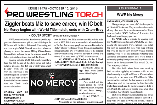 SUMMARY: This week’s newsletter begins with a cover story report on WWE’s No Mercy PPV Report and Roundtable Reviews… Wade Keller’s reviews of Raw and Smackdown with lots of analysis of segments and matches… Bruce Mitchell’s column on “Pro Wrestling for Losers”… Greg Parks’ column assessing the Tough Enough alum in light of Sara Lee’s release… Torch Newswire…