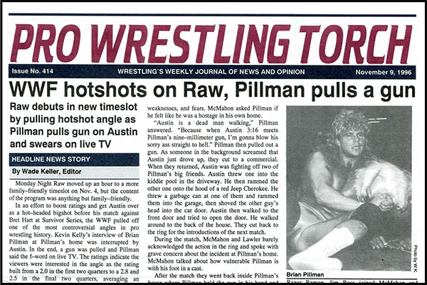 SUMMARY of #414 cover-dated November 9, 1996: This issue includes a cover story and Keller’s End Notes analysis of the infamous hotshot gun angle on Raw involving Brian Pillman and Steve Austin… Part four of Shane Douglas’s in-depth, fascinating account of his short-lived experience in the WWF and his feud with The Clique… Plus WWF Newswire, WCW Newswire, ETC. Newswire, reports on Raw, Nitro, and other TV shows, Quotebook, Letters to the Torch, and more…
