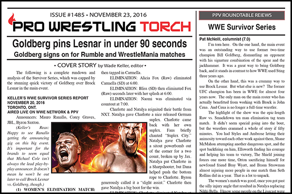 SUMMARY: This week’s newsletter is packed with Big Event coverage including Keller’s NXT Takeover Toronto report, Keller’s WWE Survivor Series report, and Keller’s Raw report, all with tons of analysis and also star ratings. Plus, Staff Reviews & Scores for Survivor Series, Greg Parks’s feature column on the Raw vs. Smackdown matches, and a brief Torch Newswire.