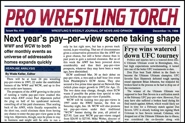 SUMMARY of #419 cover-dated December 14, 1996: This issue includes a cover story on the 1997 PPV landscape taking shape including an expanded PPV schedule… WWF Newswire includes Jim Ross’s notes on a woman filing assault charges against Shawn Michaels… WCW Newswire details the on-air Charlotte reunion of Ric Flair and Roddy Piper… Part one of the Torch Talk with upstart AWF promoter Paul Alperstein… A WCW live event report from Germany… John Williams’s feature column looks at the All Japanj 1996 Tag League… UFC Ultimate Ultimate PPV Report and Roundtable Reviews… ECW Arena report including Raven regaining the ECW Title… Plus ETC. Newswire, reports on Raw, Nitro, ECW, and other TV shows, and more.