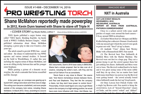 SUMMARY: This week’s newsletter begins with Wade Keller’s cover story detailing the key aspect of the VICE article regarding Shane McMahon’s power play a few years ago, plus a general critique of the analysis of the creative dynamic in WWE… Bruce Mitchell on “Invasion of the Body Snatches”… Greg Parks details his NXT house show experience… Keller’s WWE Raw and WWE Smackdown reports… Plus NXT on tour in Australia and Torch Newswire…