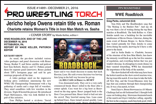 VIP NEWSLETTER – PRO WRESTLING TORCH #1489 (December 21, 2016) – Keller’s Roadblock, Raw, and SD reports, Roadblock Roundtable Staff Reviews, Parks on Total Nonstop Deletion, Newswire