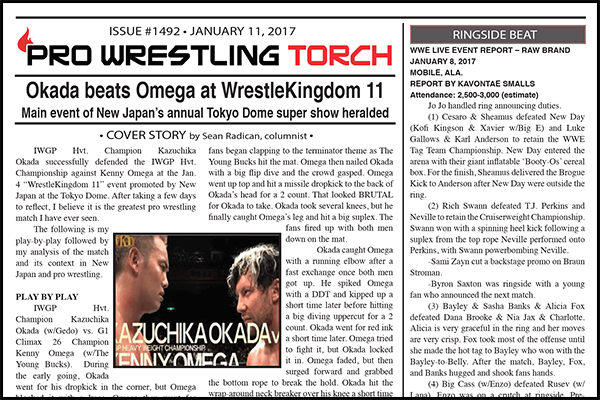 SUMMARY: This week’s PWTorch Newsletter begins with Sean Radican’s cover story detailing what he calls the greatest match he’s ever seen between Okada and Kenny Omega at Wrestle Kingdom 11 with details on the match itself and then his analysis of it… Bruce Mitchell’s column presents a look at the new WWE Network shows scheduled in 2017… Travis Bryant’s column making the case that Becky Lynch is the top babyface in wrestling… Wade Keller and Greg Parks both review the debut 2017 episode of TNA Impact with new ownership, new creative, new middle turnbuckles, but nothing else new at all… Plus Ringside Beat, Torch Newswire, Keller’s Raw Report, Keller’s Smackdown Report…