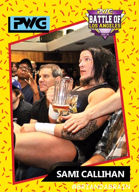 The 2016 PWG Battle of Los Angeles trading card set is comprised of 28 cards: one card for each of the 24 entrants in the BOLA tournament, and four “secret” cards of Super Dragon, Excalibur, Mount Rushmore (Adam Cole and the Young