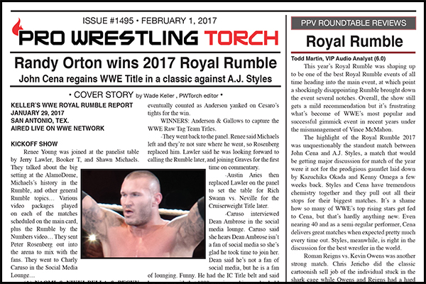 SUMMARY: This week’s PWTorch Newsletter begins with Wade Keller’s in-depth report on the WWE Royal Rumble, followed by Roundtable Reviews on the Rumble from Bruce Mitchell, Greg Parks, Travis Bryant, Pat McNeill, and Todd Martin… Then Keller’s reports on Raw and Smackdown…