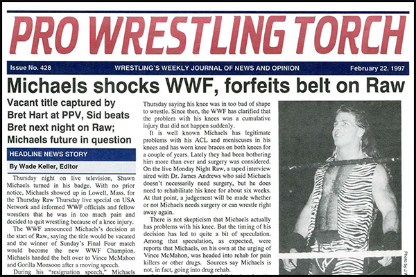 SUMMARY of #428 cover-dated February 22, 1997: This issue features a cover story on Shawn Michaels shocking the WWF and forfeiting his World Title on Raw. Wade Keller’s feature BBL editorial looks at Michaels’s decision and his future… In-depth coverage of the WWF In Your House Final Four PPV headlined with Bret Hart vs. Undertaker vs. Vader vs. Steve Austin including Keller’s match report with star ratings, Roundtable Reviews, Reader Reax, and Poll Results… Plus WWF Newswire, WCW Newswire, ECW Newswire, and TV reports on Raw, Nitro, ECW, and others…