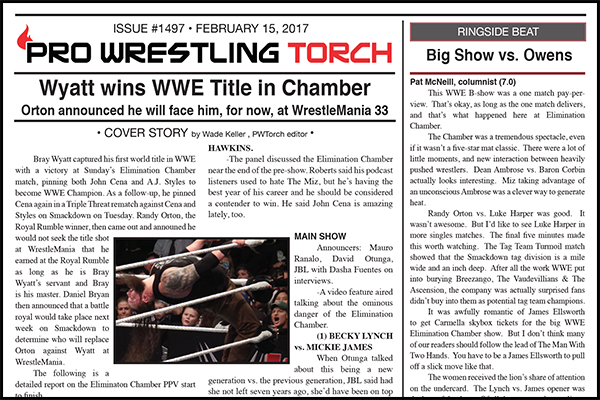 SUMMARY: This week’s PWTorch Newsletter begins with Wade Keller’s detailed report on WWE’s Elimination Chamber PPV and staff Roundtable Reviews and scores for the event… Keller’s Raw & Smackdown reports… Greg Parks’s feature column evaluating whether NXT has done an effective job actually developing talent for the main roster… Keller’s End Notes editorial looking at what this week’s WWE events mean to WrestleMania’s booking plans… Plus Torch Newswire…